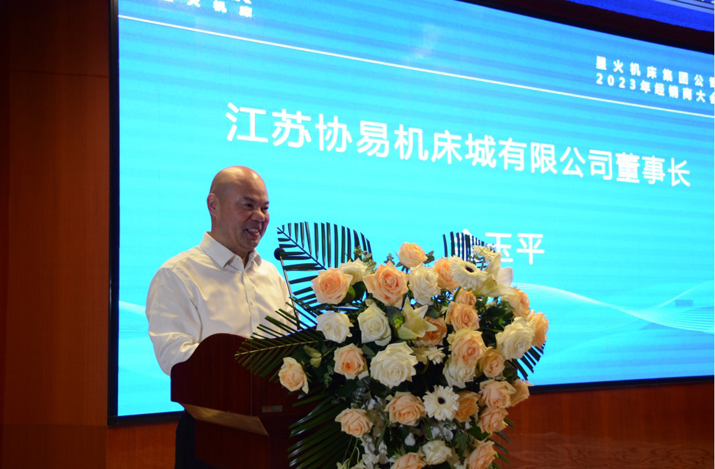 江蘇協易機床城有限公司董事長金玉平代表優秀經銷商致辭。他說星火機床作為發展了五十多年的“三線企業”,技術實力雄厚,品牌知名度,尤其近年來發揮自身優勢,搶抓市場機遇,在攻克關鍵核心技術領域“卡脖子”難題方面取得了一定成績,拓展了一定的產品市場。我們對未來合作充滿信心,愿與星火同心同德,攜手并肩作戰,實現合作共贏。