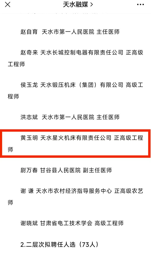 日前,天水市領軍人才第三批入選名單公布,星火機床集團公司機床研究院數控系列產品總設計師、正高級工程師黃玉明入選第三批第一層次。